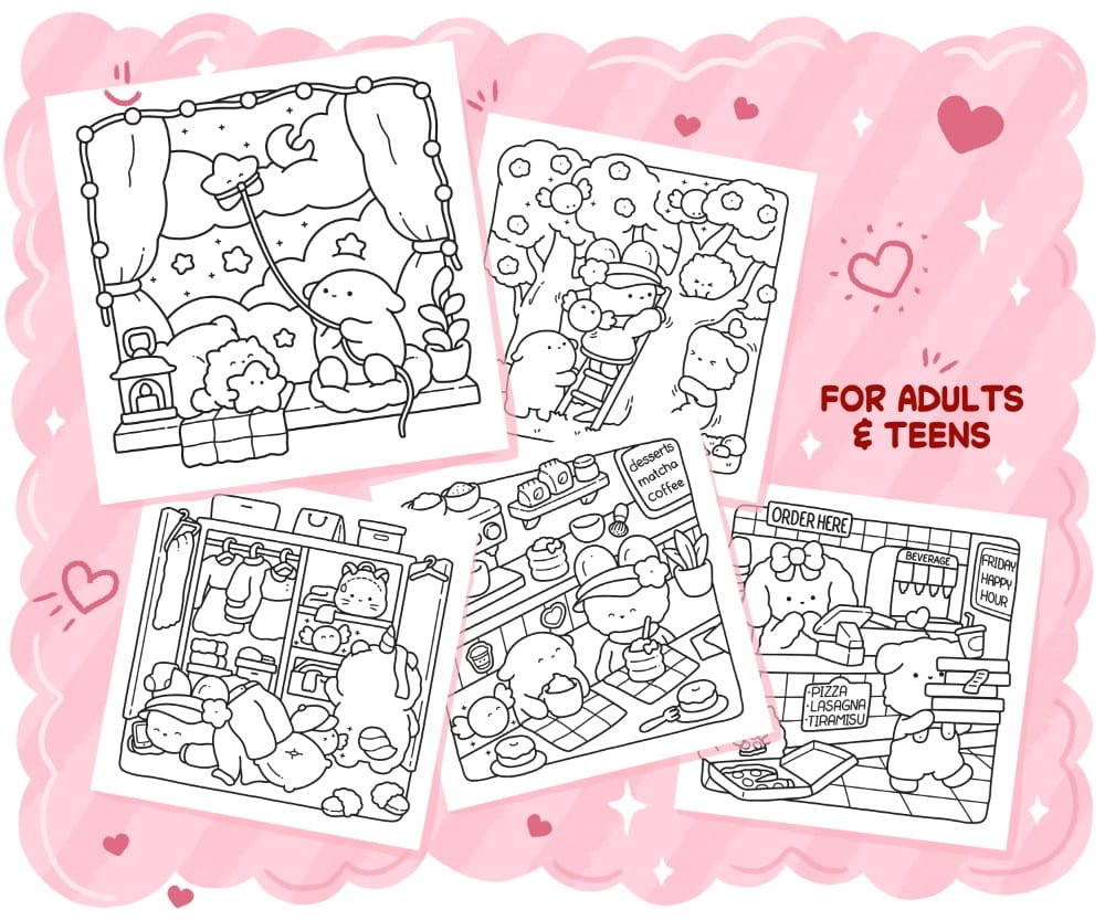 ようこそ スイート・デイズこの塗り絵は、かわいい小さな友だちと居心地のいい日常の風景でいっぱいだ。マーカーを持って、どこか柔らかい場所で丸くなり、あなたの想像力を輝かせよう。✨