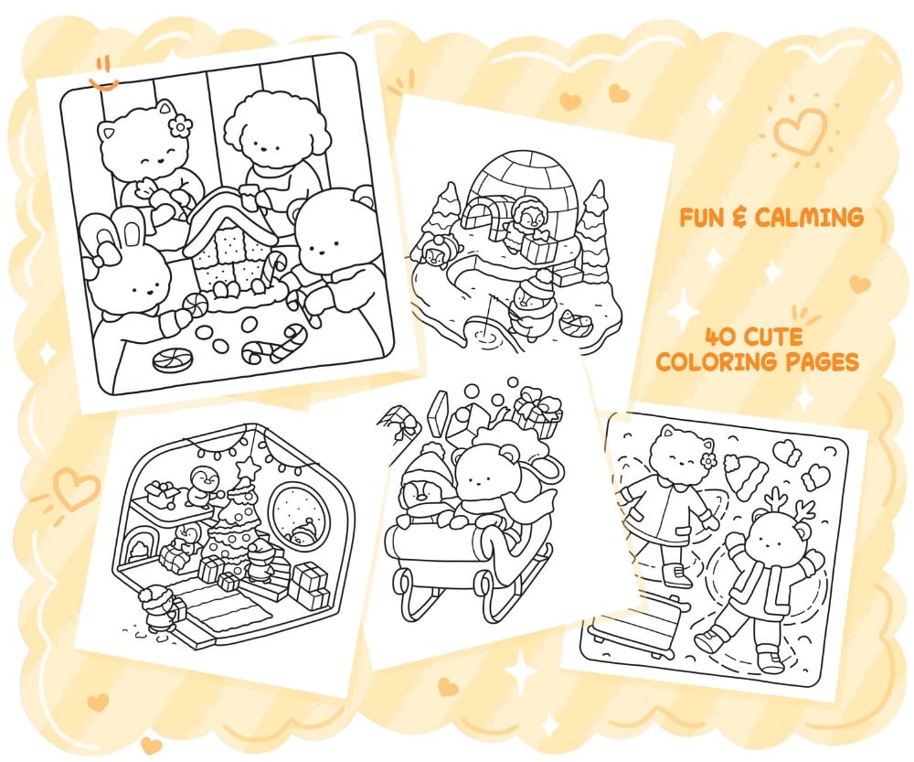 Christmas Coloring Pages, 40 Cute and Cozy Holiday Illustrations, Printable Instant Digital Download PDF Book for Fun and Relaxation