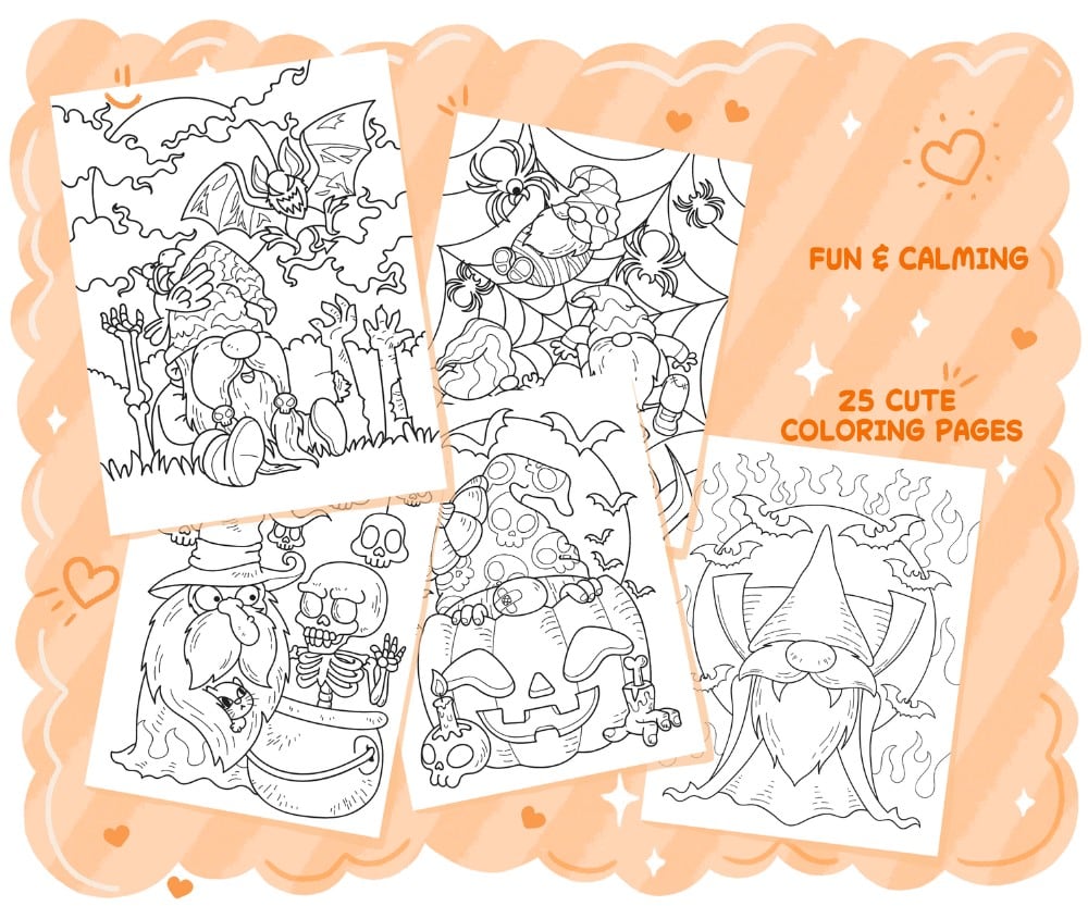A spooky-fun printable coloring book featuring 25 Halloween gnome illustrations for teens and adults