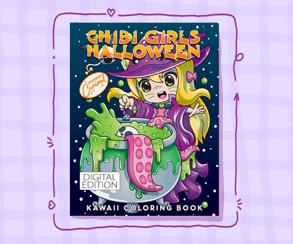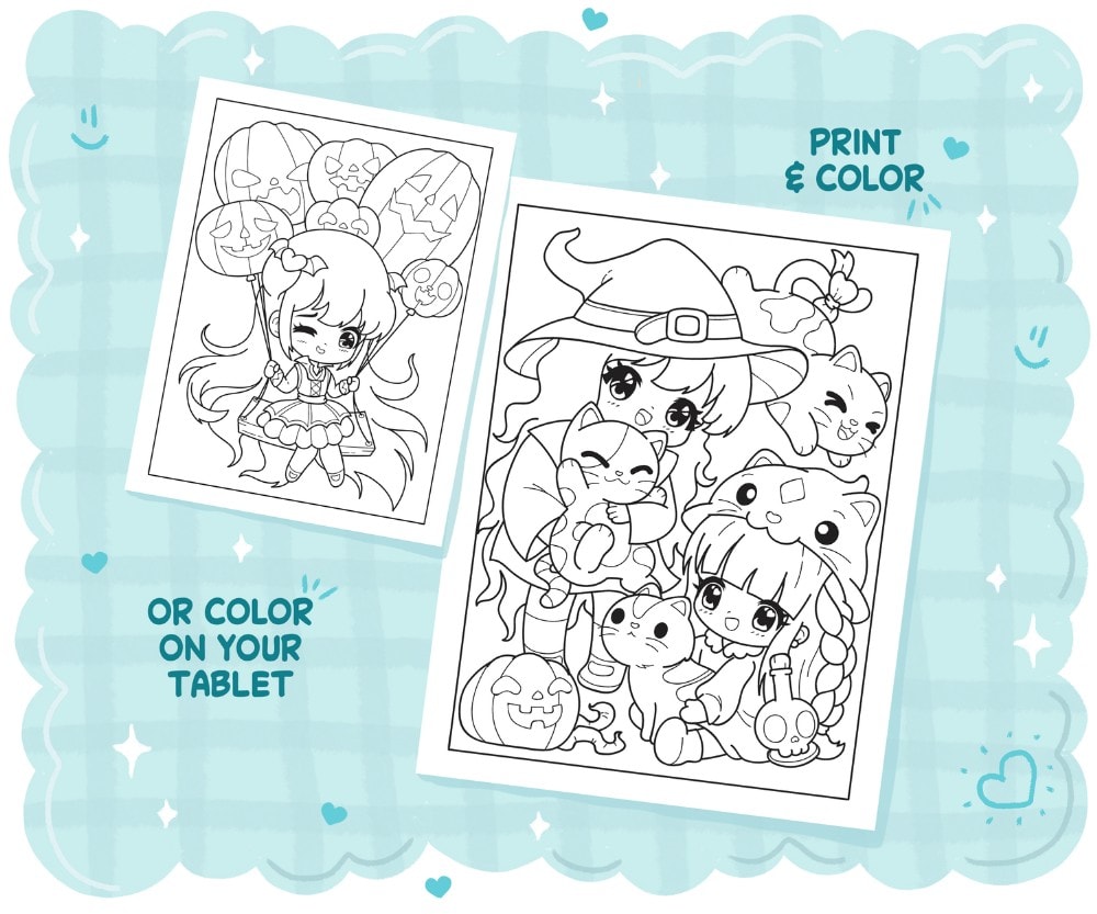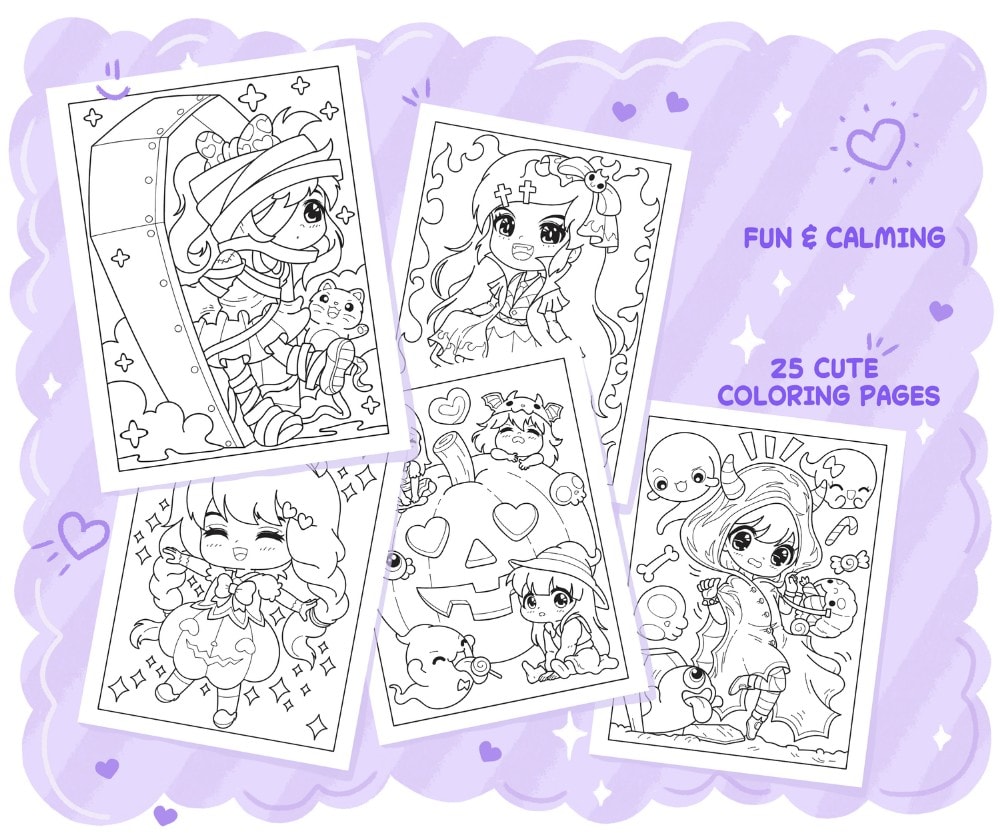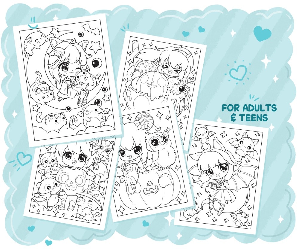 – 25 desenhos originais com raparigas chibi, animais de estimação kawaii, bonecas assustadoras e guloseimas com o tema do Dia das Bruxas.